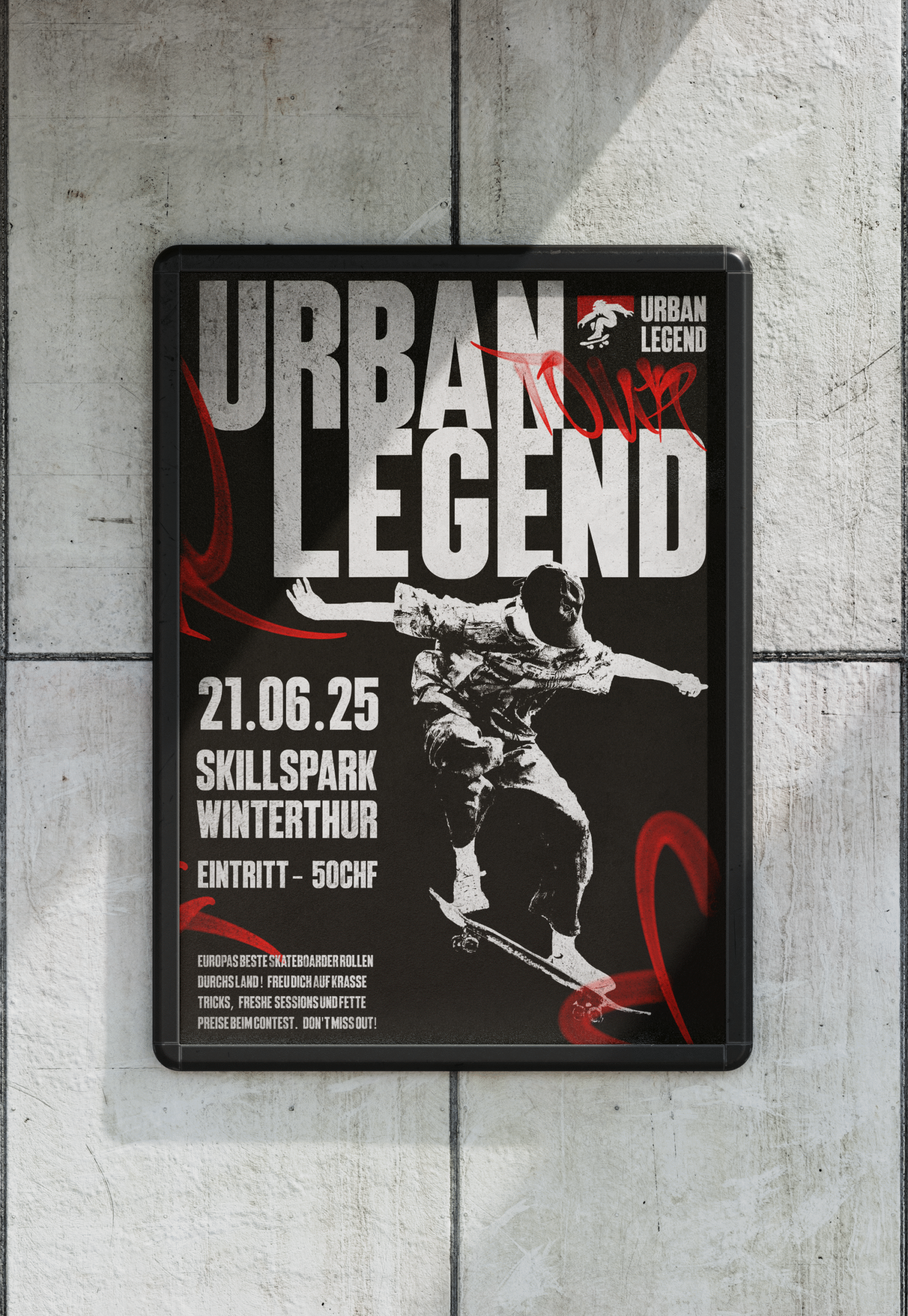 In diesem ÜK arbeitete ich in einer Vierergruppe an der Gestaltung mehrerer Printprodukte für das fiktive Skateboard Festival «Urban Legend Tour». Gemeinsam entwickelten wir ein prägnantes Logo, legten einen Styleguide fest und gestalteten ein Plakat. Zusätzlich erstellte jede Person eigenständig eine Fotomontage des Plakates sowie einen Faltflyer.
